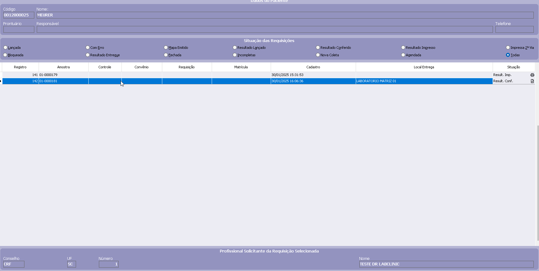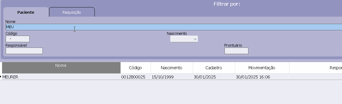 Logo em seguida, no campo NOME, poderá digitar o nome do paciente no qual é desejada a mudança da requisição e então dar um duplo clique no nome selecionado para que possa entrar em uma nova janela, onde poderá selecionar a requisição a ser alterada.