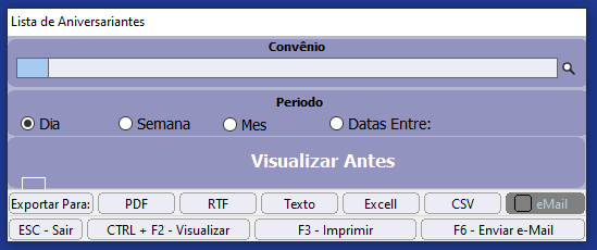 É a opção que o usuário tem para digitar o convenio podendo ser particular ou qualquer outro , onde tem a função de visualizar os pacientes que fazem aniversário podendo ser no dia, semana, mês ou podendo variar de Datas.