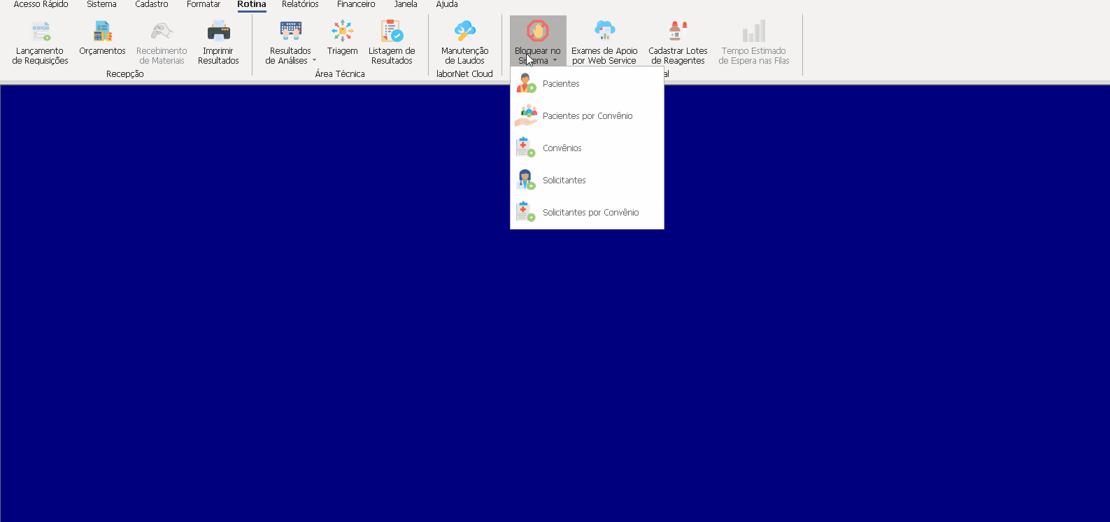 Para um determinado paciente que não atende suas devidas funções ou por quaisquer outras razões não específicas ou não. Para isso, tem a opção de bloquear o Paciente/Requisição/Convenio/Solicitante/Médico. Basta ir em Rotina> Bloqueio no Sistema > (Selecionar).