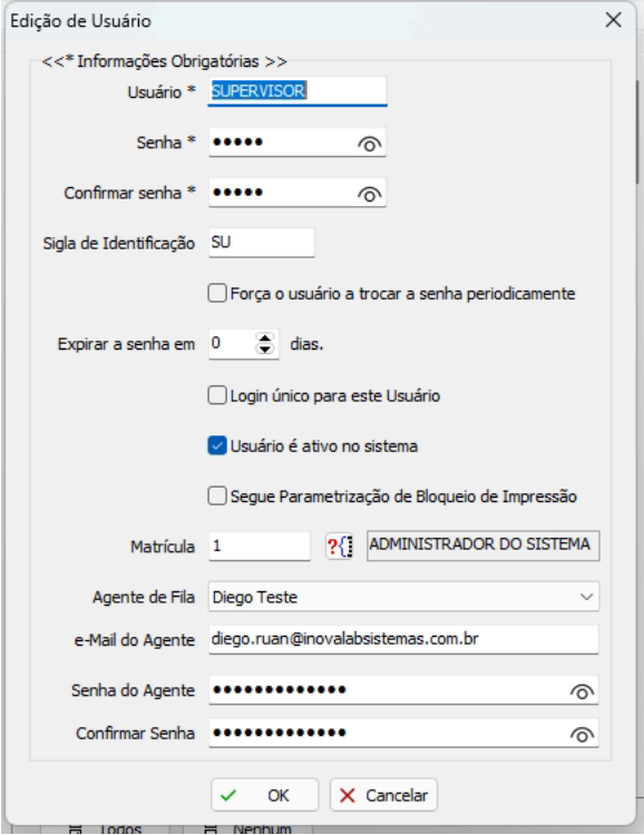 3. É preciso, então, selecionar o Agente do NextQS que representa o Usuário no labClinic e pressionar OK.