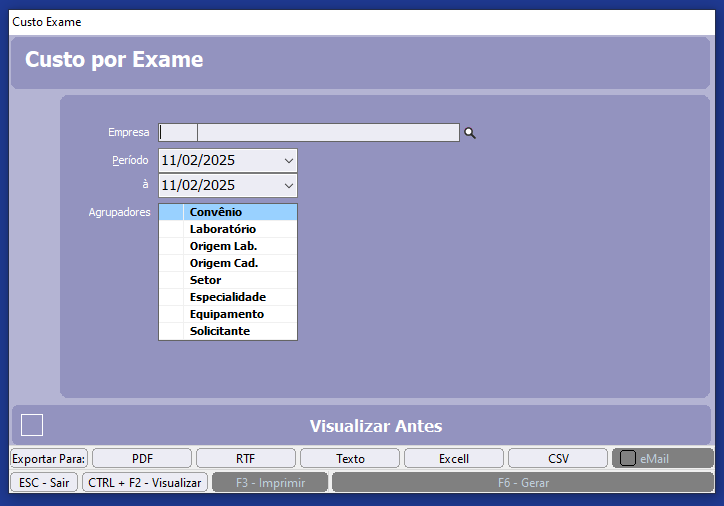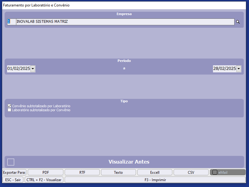 Tipo: Selecione Convênio Subtotalizado por Laboratório ou Labóratorio Subtotalizado por Convênio.