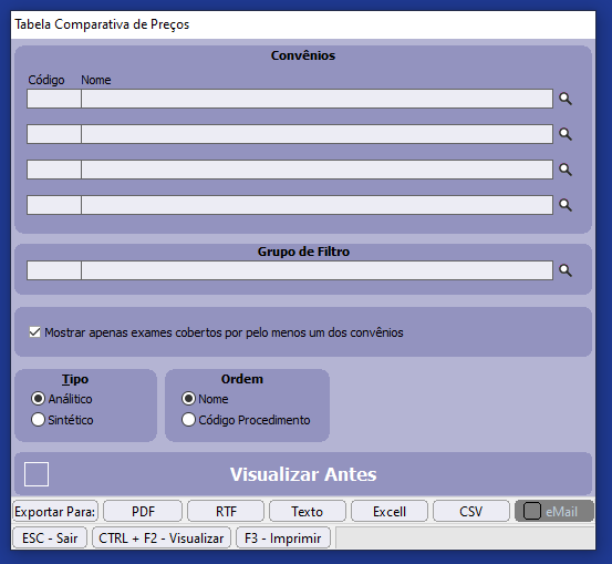 Convênios: Selecione os convênios que deseja fazer o comparativo.
