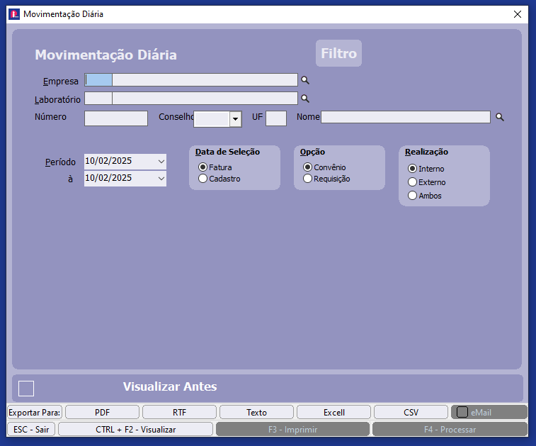 Laboratório: Informe o código do laboratório. Se preferir consulte o arquivo teclando F2 ou Selecionar Todos.