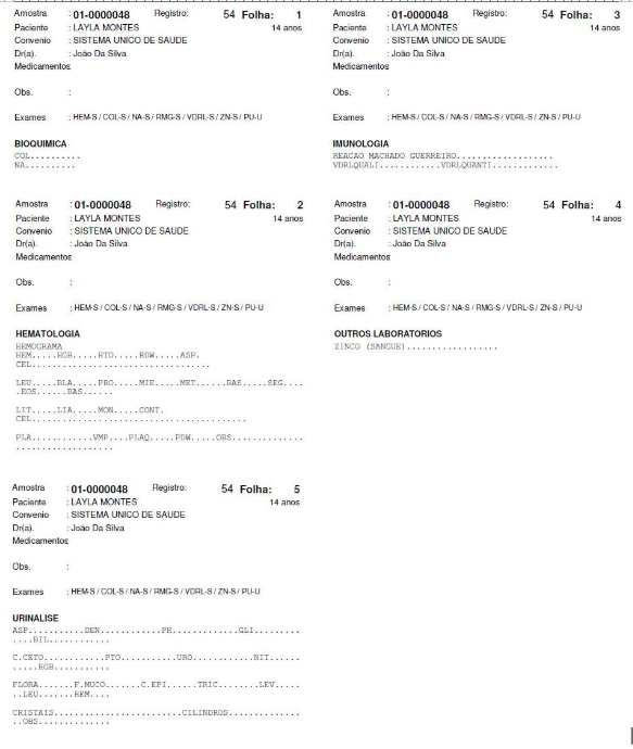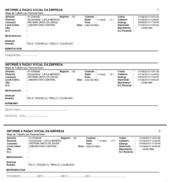 Já o mapa Paciente Setor é um mapa que dá mais autonomia, pois devido o fato de imprimir cada setor em meia página, o mesmo já pode ser enviado às distintas áreas técnicas para assim já serem realizados os exames. Este modelo permite também a conferência dos resultados quando da assinatura do laudo, sendo anexado junto com os exames para o bioquímico realizar a conferência.