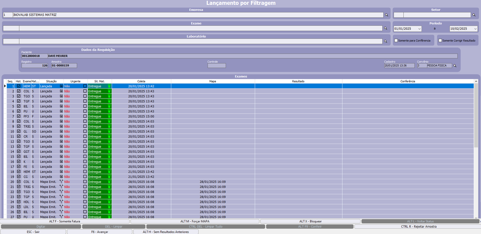 ALT+M – Forçar Mapa: Altera o status do exame selecionado de Lançado para Mapa Emitido.