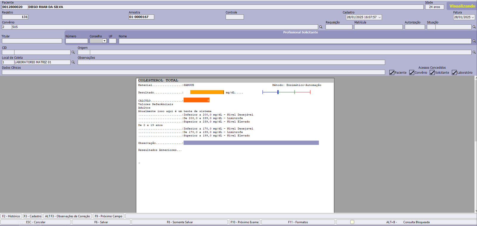 Informe o resultado do exame e pressione F6 para salvar. Automaticamente o sitema abrirá no laudo do próximo exame da lista.