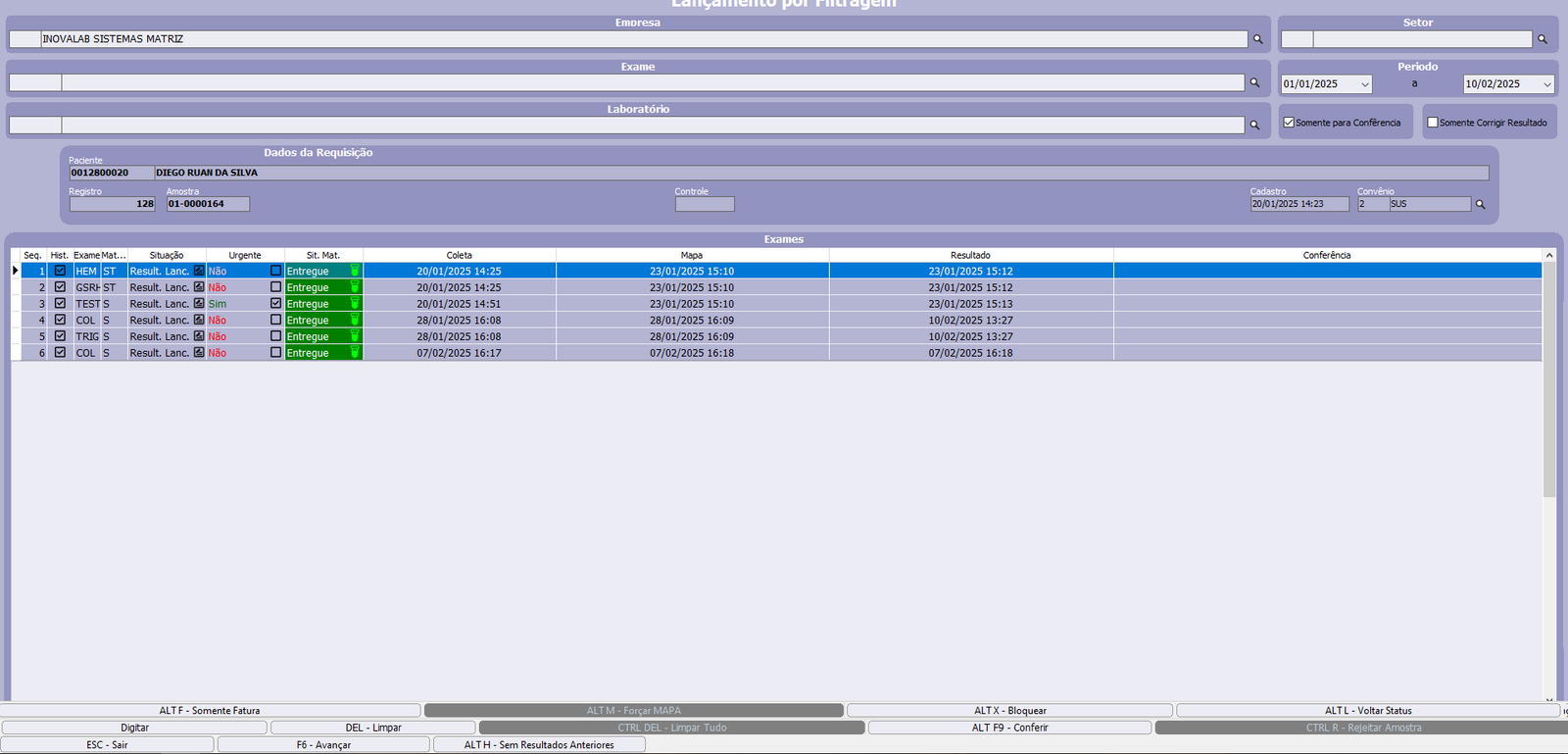 F6 – Confirmar: Marca o exame como Conferido.