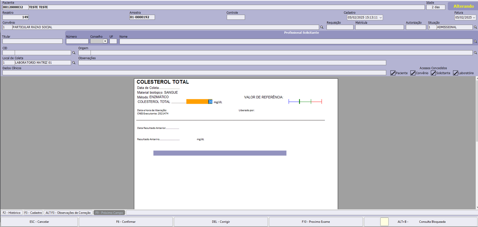 DEL – Corrigir: Caso o resultado do exame esteja incorreto essa opção habilita a tela para realizar a correção do resultado.