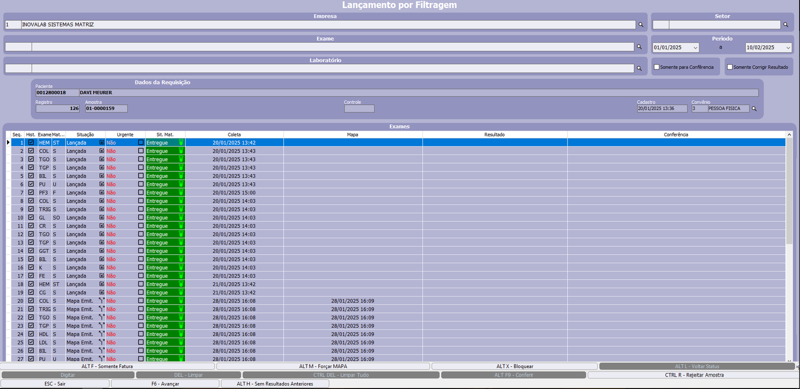 ALT+M – Forçar Mapa: Altera o status do exame selecionado de Lançado para Mapa Emitido.