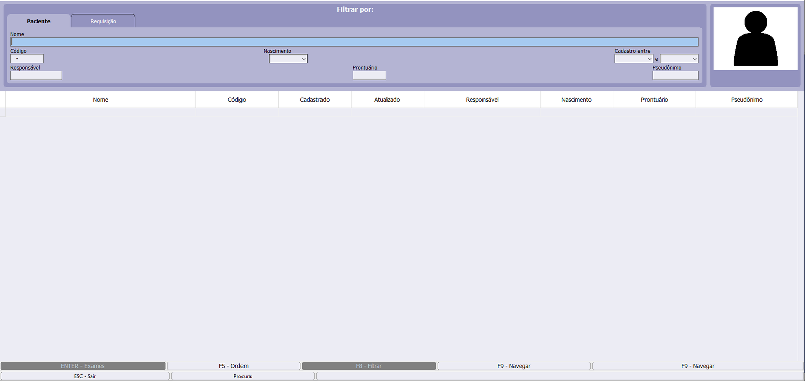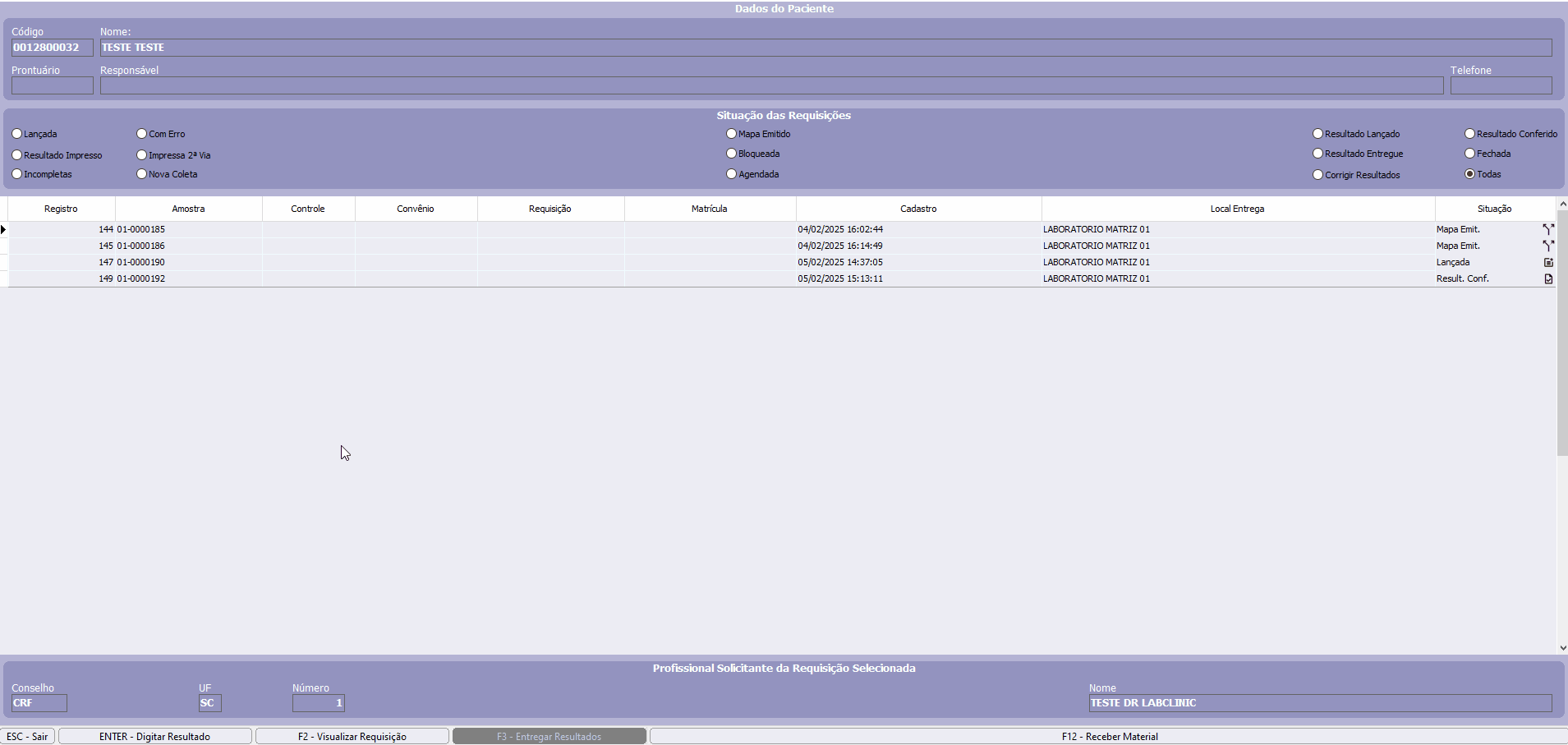 Ao selecionar um determinado paciente todas as requisições que o paciente possui serão exibidas. Você pode usar as teclas direcionais para alterar o filtro de como as requisições são exibidas: