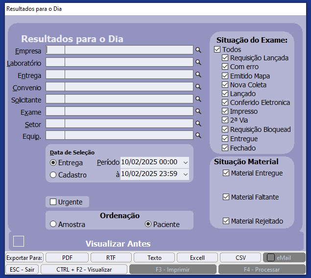Situação do Exame: Informe a situação dos exames que deseja verificar os resultados para o dia (Todos, Requisição Lançada, Com erro, Emitido Mapa, Lançado, Conferido Eletronicamente, Impresso, 2 Via, Requisição Bloqueada, Entregue, Fechado).
